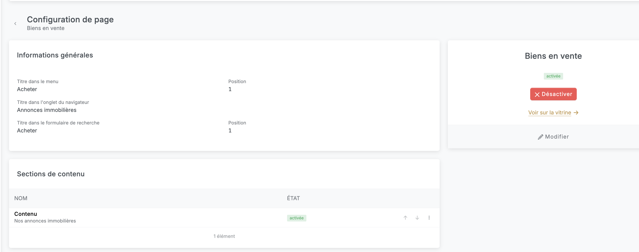 • État : La page est activée par défaut, mais peut être désactivée si nécessaire.