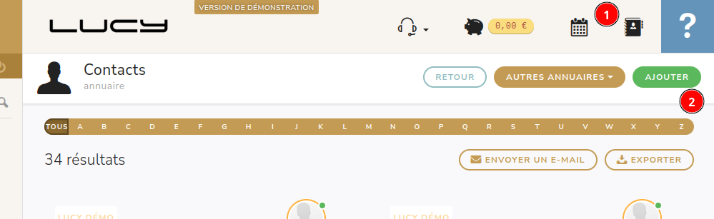 Pour créer un nouvel utilisateur, accède à l'annuaire en cliquant sur le bouton en haut à droite (1) puis clique sur le bouton « Ajouter » (2).