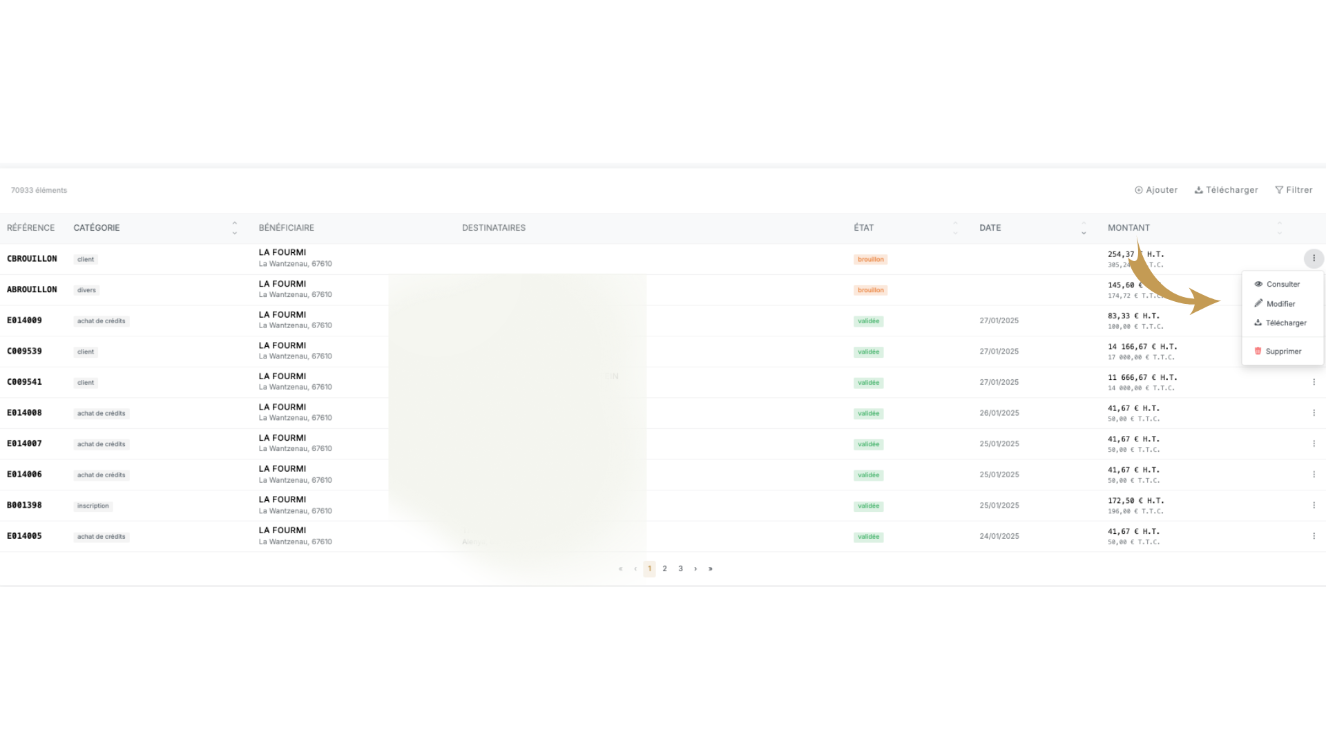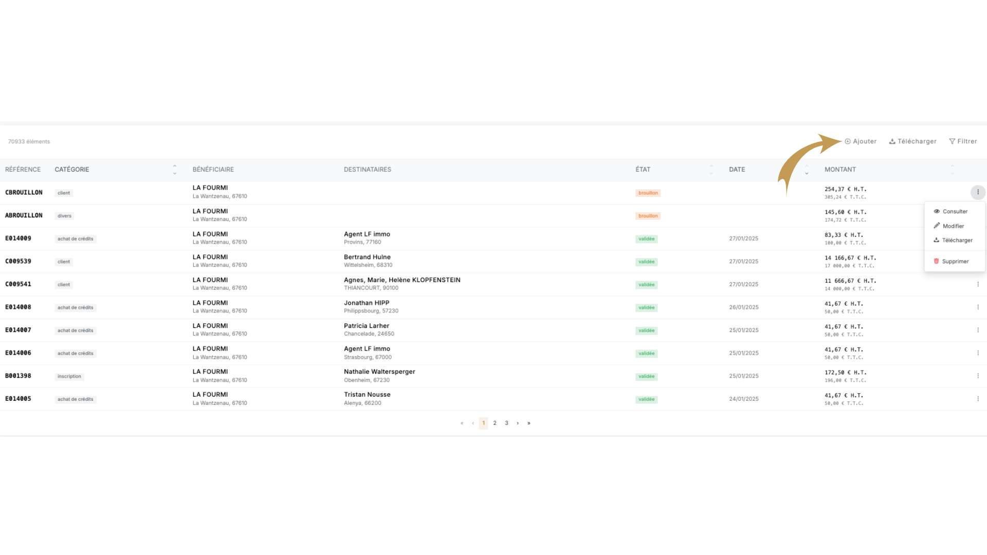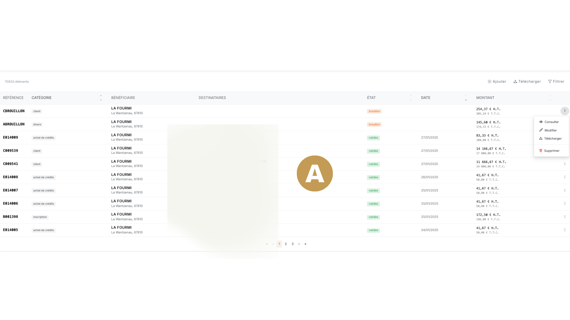 • Filtrer les factures : Utilisez les champs de recherche ou le filtre pour sélectionner par référence, catégorie, état, date, ou montant HT.