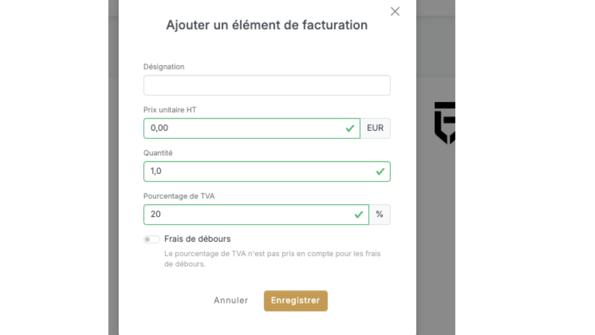 • Enregistrez l’élément pour le voir apparaître dans la liste des items de la facture.