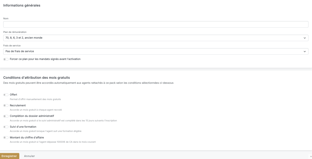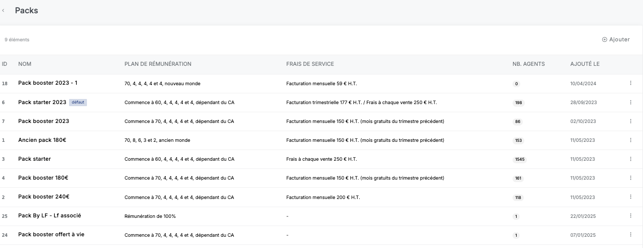 Cette interface permet d’administrer différents packs destinés aux agents, avec des options flexibles pour la rémunération et les frais de service.