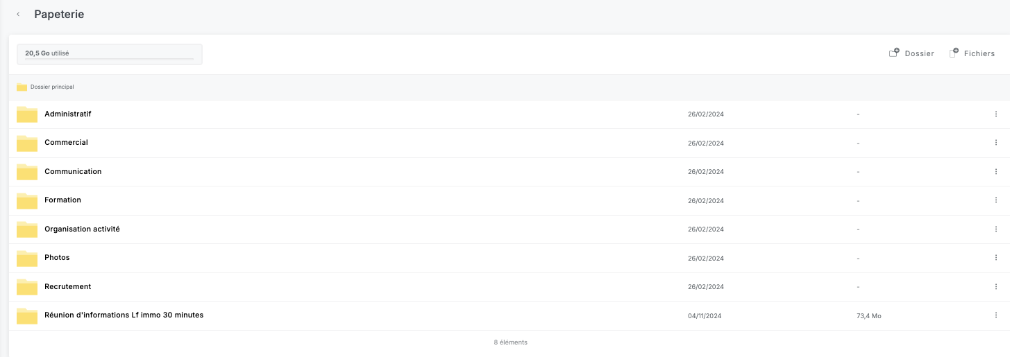 La papeterie indique la capacité utilisée (exemple : 20,5 Go utilisés). Assurez-vous de ne pas dépasser l’espace alloué.