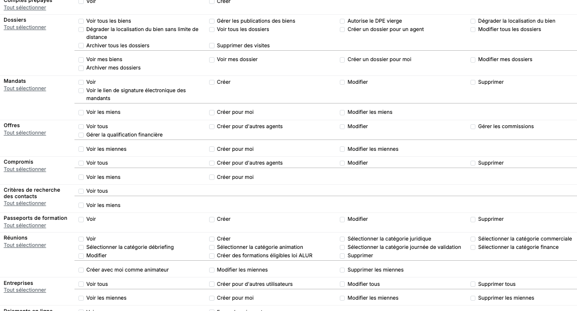 • Accès à l’extranet : Permet d’interagir avec les biens, mandats, dossiers et autres éléments liés à l’activité commerciale. Il inclut des actions comme la création, la modification et la suppression de certaines données.