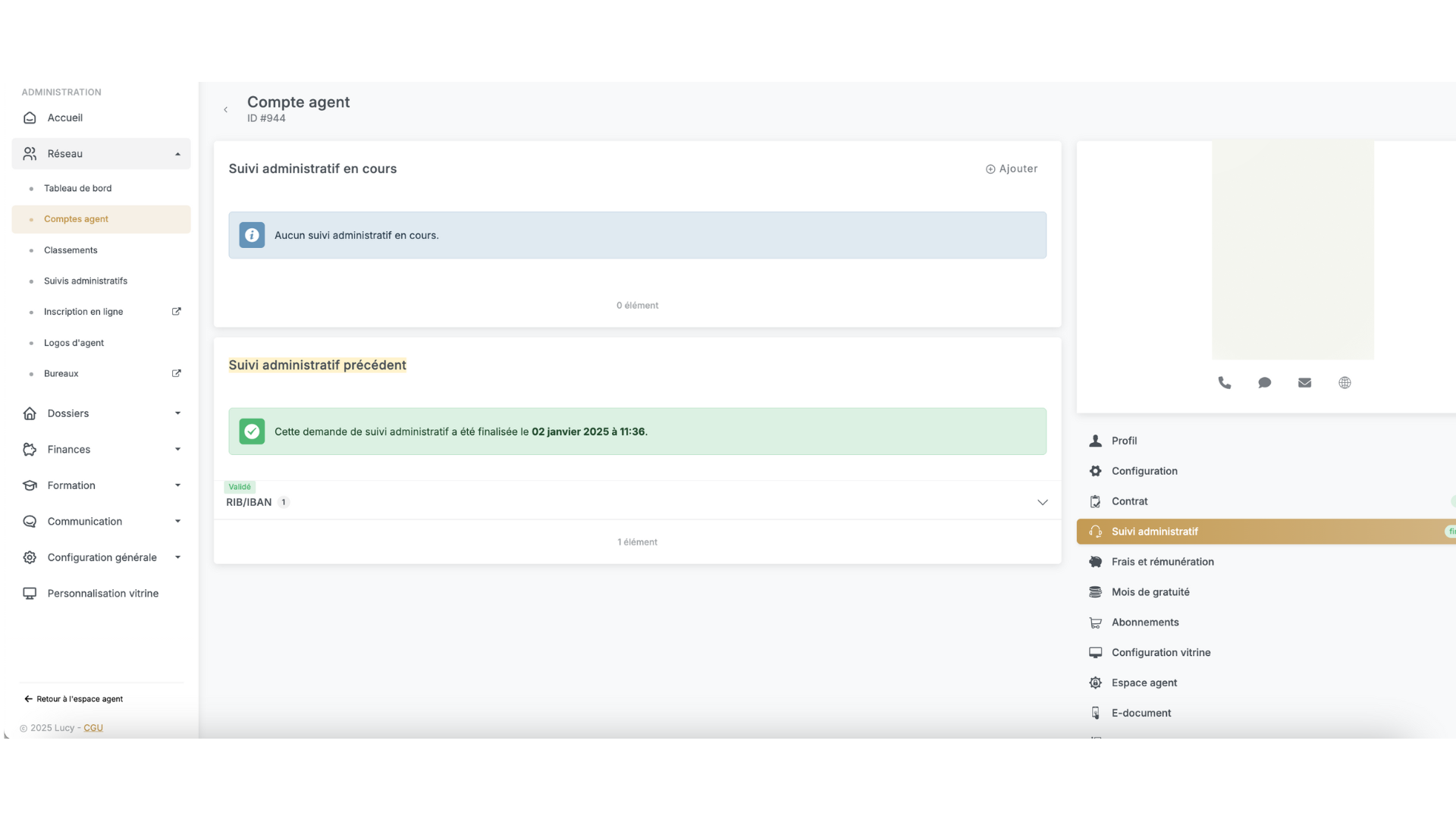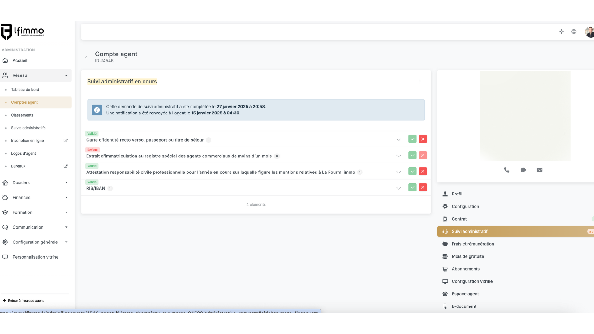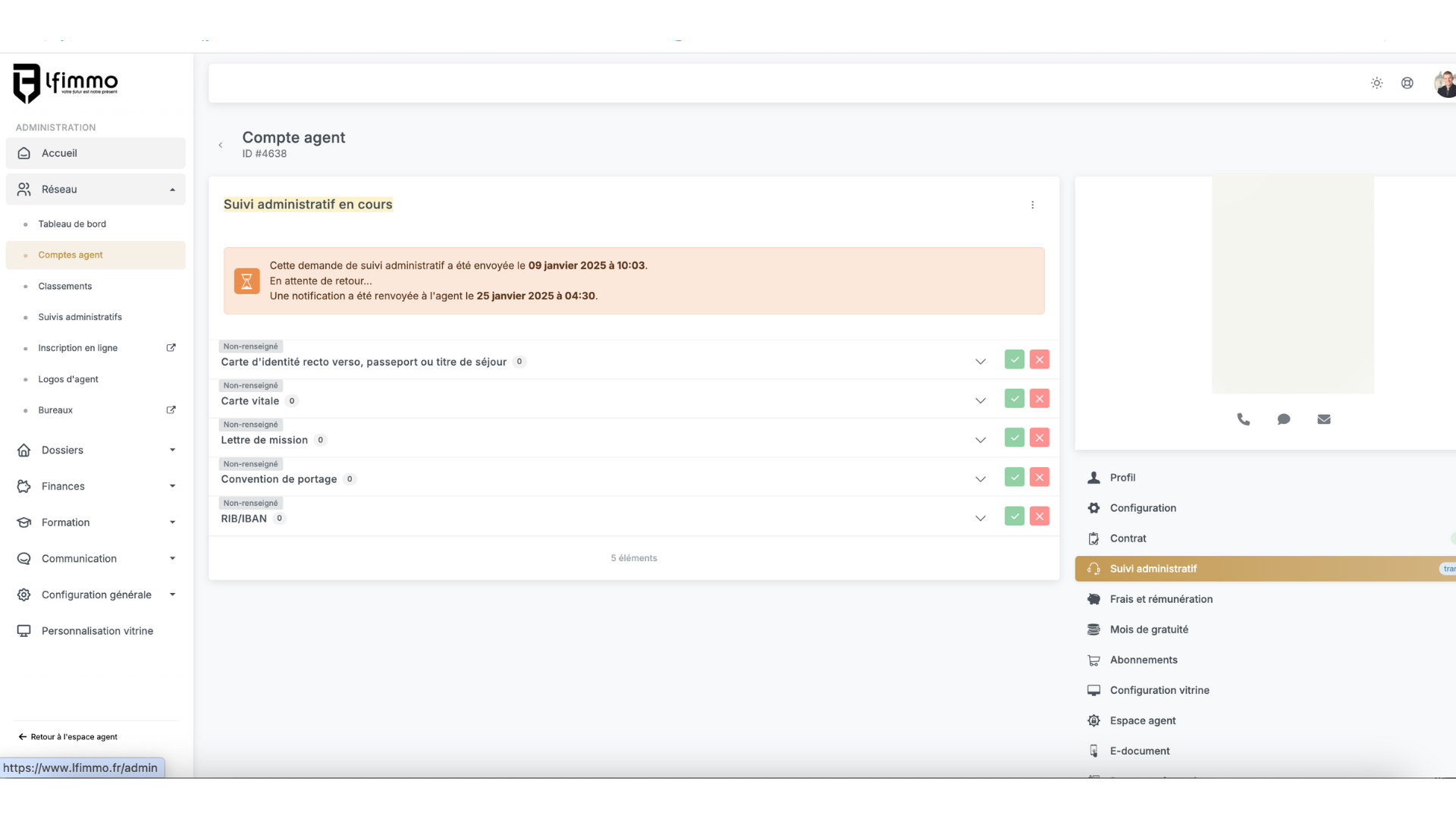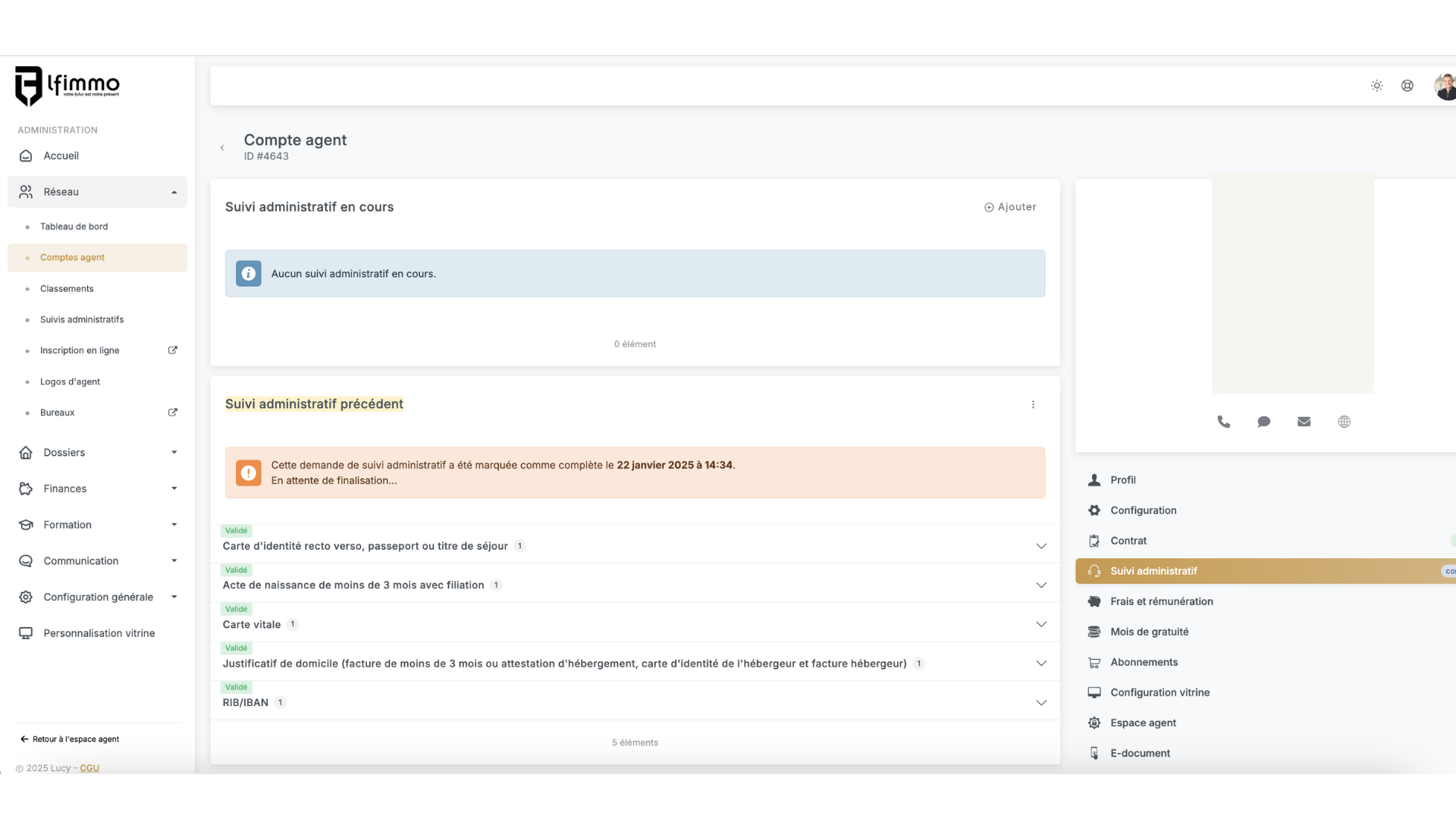 Le suivi administratif permet de gérer et contrôler les documents des agents. Il assure un suivi en temps réel et garantit que chaque agent possède tous les documents nécessaires pour exercer son activité.
